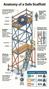 Giàn giáo bao gồm các thành phần nền móng, kết cấu và an toàn hoạt động cùng nhau để tạo ra một nền tảng làm việc ổn định ở độ cao.
