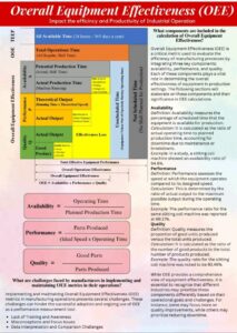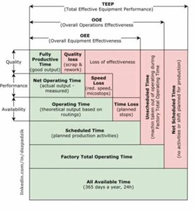 Tính khả dụng: Thời gian hoạt động thực tế so với thời gian sản xuất theo kế hoạch, tính đến thời gian ngừng hoạt động như hỏng hóc, hỏng hóc và chuyển đổi.