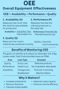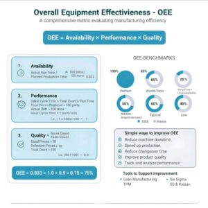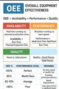 Bằng cách nhân ba yếu tố này, OEE cung cấp một thước đo toàn diện về hiệu quả của thiết bị và làm nổi bật các lĩnh vực cần cải thiện.