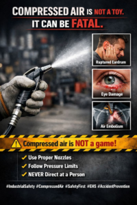Nhiều công nhân coi khí nén như một chiếc quạt công suất cao – dùng nó để phủi bụi quần áo hoặc nghịch ngợm trong xưởng. Thói quen “vô hại” này có thể gây tử vong. Khí nén là một nguồn năng lượng tập trung đòi hỏi sự tôn trọng tương tự như điện cao thế hoặc máy móc hạng nặng.