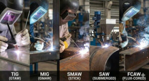 TIG, hay Hàn hồ quang vonfram khí (GTAW), sử dụng điện cực vonfram không tiêu hao và che chắn khí trơ để hàn chính xác, chất lượng cao trên kim loại mỏng và hợp kim. MIG, hay Hàn hồ quang kim loại khí (GMAW), sử dụng điện cực dây tiêu hao được cấp liên tục với khí bảo vệ, cho phép lắng đọng nhanh chóng để chế tạo chung. SMAW (Stick) dựa trên các điện cực tiêu hao được phủ cung cấp tấm chắn thông lượng riêng, làm cho nó chắc chắn cho công việc ngoài trời và kết cấu.