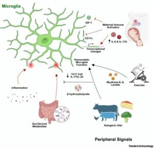 Tế bào microglia phản ứng với các tín hiệu đến từ viêm nhiễm, lão hóa, tập thể dục, chế độ ăn uống, hệ vi sinh vật đường ruột, chất chuyển hóa và hoạt động miễn dịch ngoại vi.