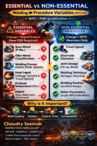 Trong thông số kỹ thuật quy trình hàn (WPS), các biến thiết yếu là các thông số ảnh hưởng trực tiếp đến các tính chất cơ học của mối hàn, chẳng hạn như độ bền và độ dẻo dai, yêu cầu đánh giá lại nếu thay đổi. Các biến không thiết yếu ảnh hưởng đến hình thức hoặc hiệu quả nhưng không ảnh hưởng đến tính toàn vẹn cơ học, vì vậy các thay đổi chỉ cần sửa đổi WPS mà không cần kiểm tra lại.
