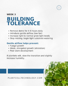 Tăng dần luồng không khí (mở quạt hoặc lỗ thông hơi) để củng cố thân cây và giảm các vấn đề về nấm, nhưng không thổi chúng bằng gió mạnh.