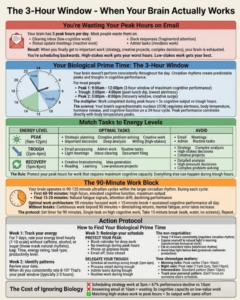“Cửa sổ 3 giờ” đề cập đến một khái niệm năng suất trong đó hiệu suất nhận thức cao nhất của não bạn – đặc biệt là các chức năng vỏ não trước trán như ra quyết định và tư duy chiến lược – kéo dài khoảng 2-3 giờ sau khi thức dậy.