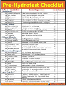 Danh sách kiểm tra trước khi thử nghiệm hydrotest Danh sách kiểm tra trước khi thử nghiệm thủy lực đảm bảo hệ thống đường ống, bình chịu áp lực hoặc bể chứa an toàn và sẵn sàng cho thử nghiệm áp suất thủy tĩnh để xác minh tính toàn vẹn trước khi vận hành. Bước […]