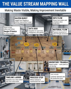 VSM lập sơ đồ từng bước trong quy trình, phân biệt các hoạt động gia tăng giá trị với các hoạt động không gia tăng giá trị như chờ đợi hoặc hàng tồn kho dư thừa. Các nhóm tạo bản đồ “trạng thái hiện tại” bằng cách quan sát quy trình làm việc thực, sau đó phát triển bản đồ “trạng thái tương lai” để loại bỏ lãng phí và hợp lý hóa dòng chảy.