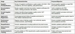 Dưới đây là ma trận Đánh giá và Giám sát Nhà cung cấp theo quy định về việc tuân thủ Chỉ thị Thiết bị Áp suất (PED), phác thảo các giai đoạn, tiêu chí và hoạt động giám sát chính: