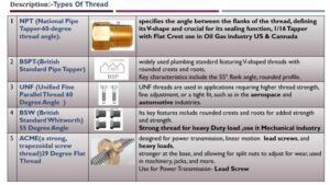 Dưới đây là tổng quan nhanh về một số loại ren công nghiệp được sử dụng rộng rãi như NPT, BSPT, UNF, BSW và ACME.