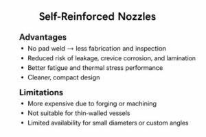 Nozzle tự gia cường thường được rèn để cải thiện độ bền và độ dẻo dai, đồng thời tuân thủ các quy tắc thiết kế như ASME Phần VIII. Chúng thường được làm từ các vật liệu như thép cacbon, thép không gỉ, thép hợp kim và hợp kim hiệu suất cao, tùy thuộc vào yêu cầu ứng dụng. Những Nozzle này có xu hướng đắt hơn các loại không tự gia cố nhưng mang lại lợi thế trong việc xử lý áp suất cao, chu kỳ nhiệt, tải trọng rung động và vỏ bình dày. Chúng được ưa chuộng cho các điều kiện dịch vụ quan trọng và khắt khe do sức bền tích hợp và khả năng chống mỏi được cải thiện, giảm các điểm hỏng hóc tiềm ẩn liên quan đến tấm gia cường.