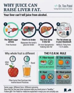 Nước ép trái cây có hàm lượng fructose cao, một loại đường chủ yếu được gan xử lý. Không giống như trái cây nguyên quả, quá trình ép nước loại bỏ chất xơ, dẫn đến sự hấp thụ đường nhanh chóng và gây gánh nặng cho gan, khiến gan phải chuyển hóa lượng fructose dư thừa thành chất béo. Quá trình này, được gọi là quá trình tổng hợp chất béo mới (de novo lipogenesis), thúc đẩy sự tích tụ chất béo và làm trầm trọng thêm bệnh gan nhiễm mỡ không do rượu (NAFLD).