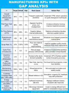 Phân tích khoảng cách KPI sản xuất so sánh hiệu suất thực tế với các mục tiêu đã đặt ra để xác định thiếu sót và thúc đẩy cải tiến. Quá trình này làm nổi bật sự kém hiệu quả trong sản xuất, chất lượng và hoạt động.