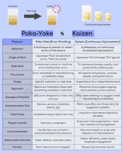 Poka-Yoke phản ứng với những sai lầm tiềm ẩn bằng các rào cản vật lý hoặc logic, chẳng hạn như phích cắm USB chỉ phù hợp với một chiều. Kaizen chủ động tìm kiếm các đề xuất để có quy trình làm việc tốt hơn, chẳng hạn như tổ chức lại máy trạm.