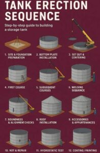 Trình tự này đảm bảo tính ổn định của cấu trúc, độ chính xác của căn chỉnh và tính toàn vẹn của mối hàn cho các bể chứa lớn, tuân theo các tiêu chuẩn điển hình của ngành và API về lắp đặt và an toàn của bể.