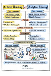 Tư duy phản biện đánh giá thông tin một cách khách quan để hình thành các phán đoán hợp lý, trong khi tư duy phân tích chia nhỏ các vấn đề phức tạp thành các phần nhỏ hơn để kiểm tra có hệ thống. Tư duy phân tích tập trung vào logic và các mẫu dữ liệu, trong khi tư duy phản biện nhấn mạnh đặt câu hỏi về các giả định và xem xét nhiều quan điểm. Cả hai kỹ năng bổ sung cho nhau trong việc ra quyết định và giải quyết vấn đề.