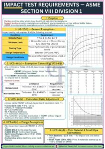 Tóm lại, ASME Phần VIII Phân khu 1 yêu cầu kiểm tra va đập độ dẻo dai chủ yếu đối với thép cacbon và thép hợp kim thấp tùy thuộc vào nhiệt độ và độ dày thiết kế, với các điều khoản miễn trừ rõ ràng và quy trình thử nghiệm chi tiết được nêu trong UG-20, UCS-66 và UG-84.