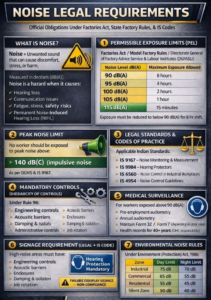 Các quy định về tiếng ồn theo Đạo luật Nhà máy của Ấn Độ, Quy tắc Nhà máy Tiểu bang và Quy tắc IS tập trung vào việc bảo vệ người lao động khỏi bị mất thính lực trong môi trường công nghiệp, chủ yếu thông qua các giới hạn phơi nhiễm và tiêu chuẩn đo lường.